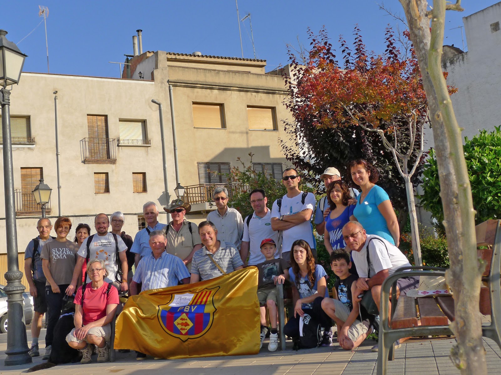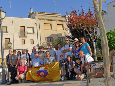 Comença el dia amb clarianes, tot i que per la nit ha fet un xàfec. A punt per començar a caminar, fem la primera foto al punt de sortida amb la bandera de la Penya.